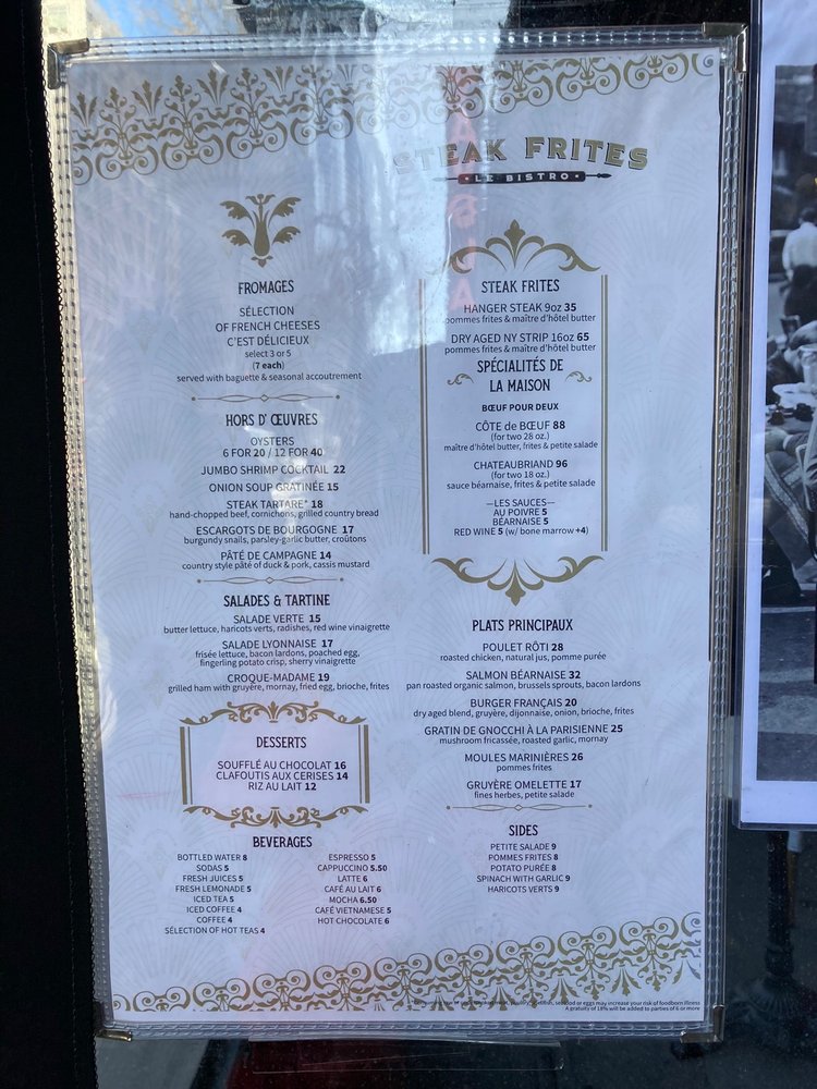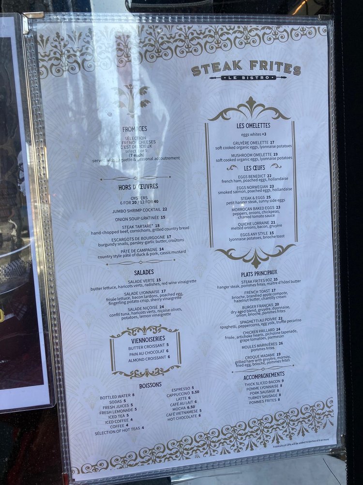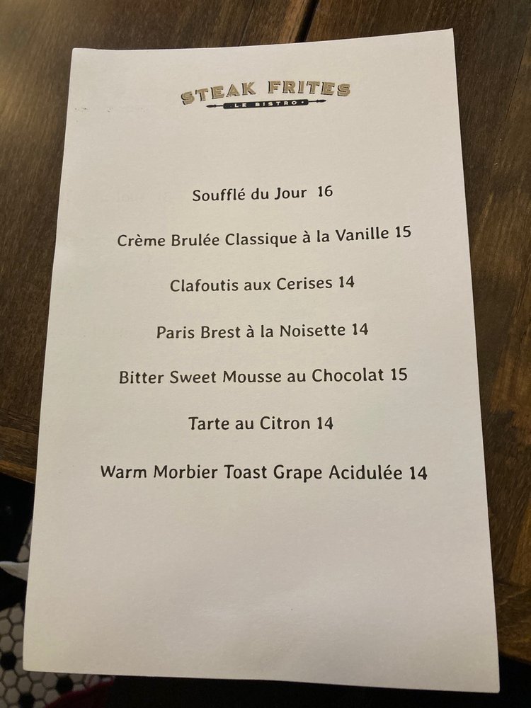 The charming décor, attentive service, and quality ingredients create an ambiance reminiscent of a cozy Parisian café. Whether you're here for a romantic dinner or a casual outing, Steak Frites Bistro promises to deliver a memorable and satisfying dining experience.